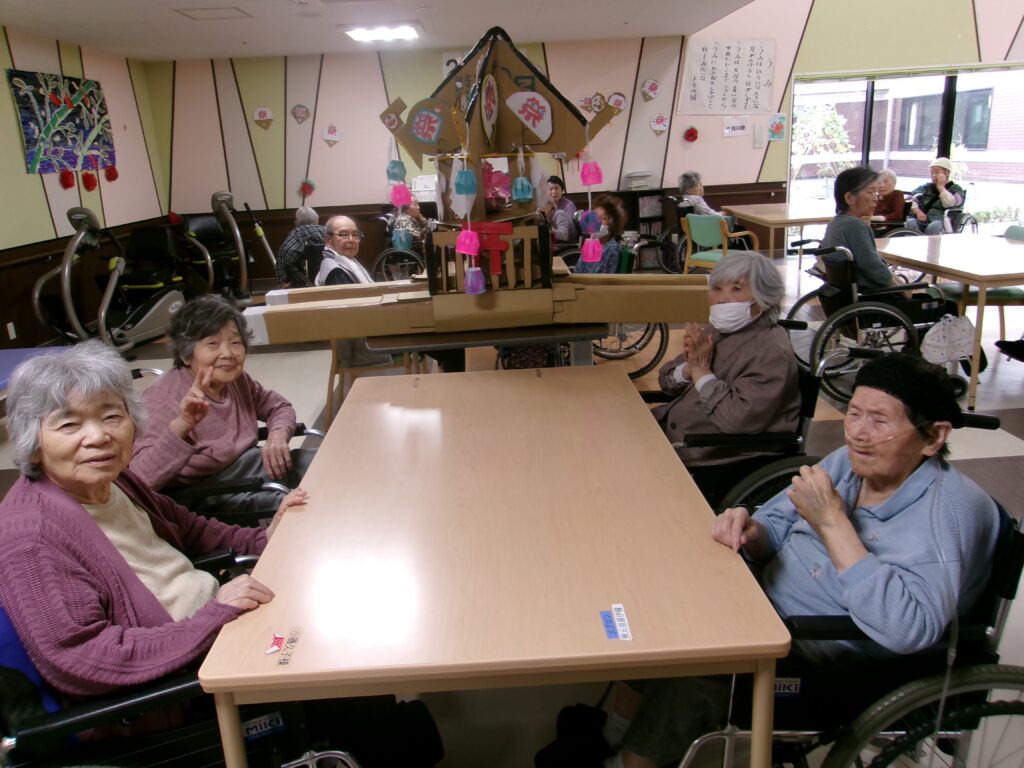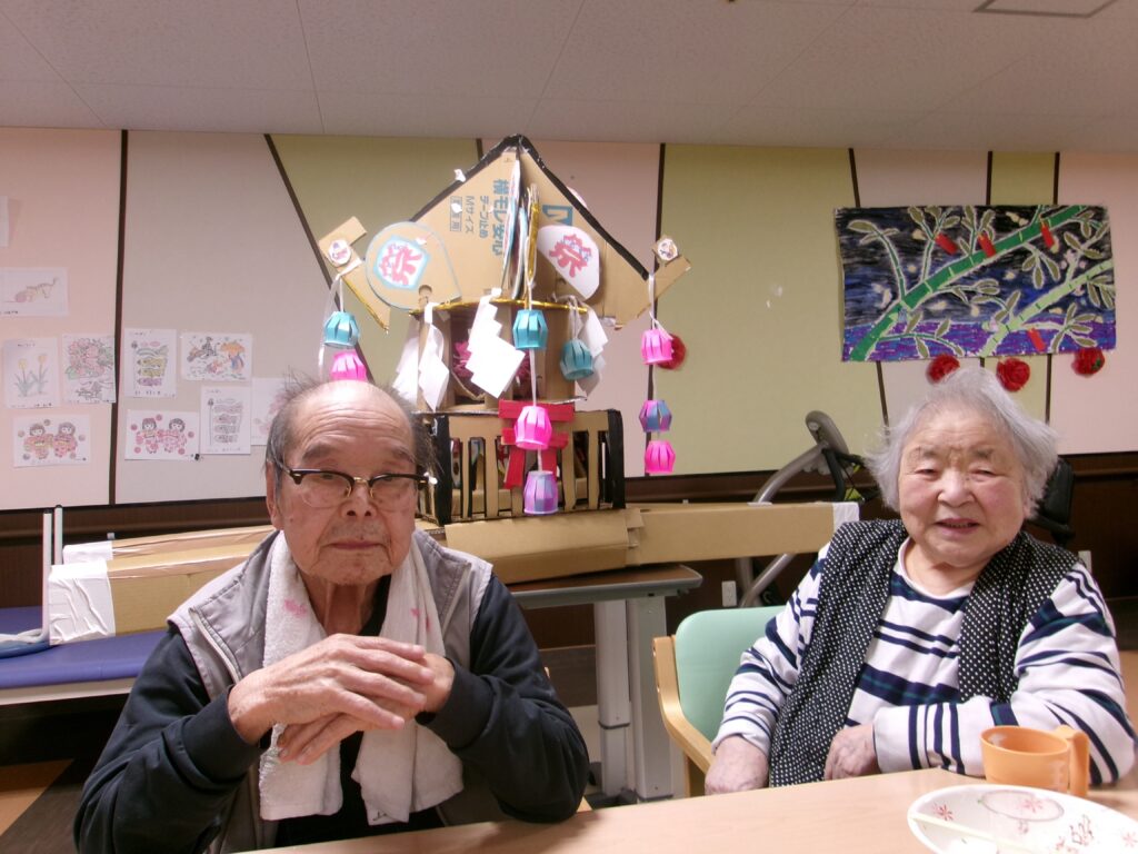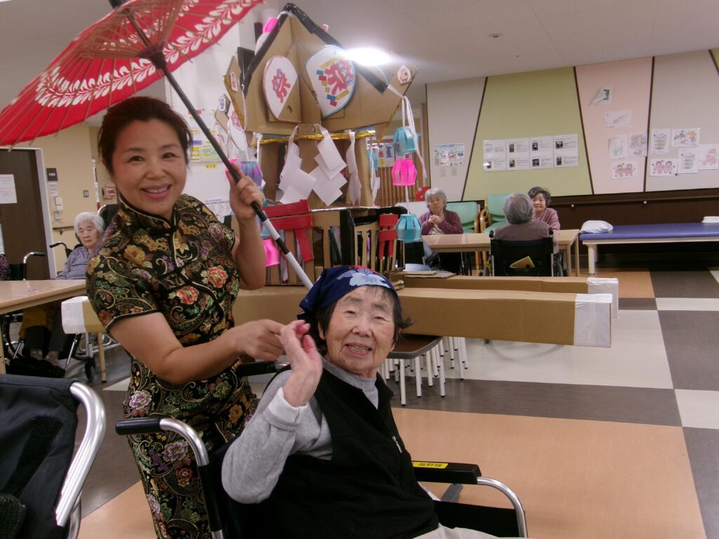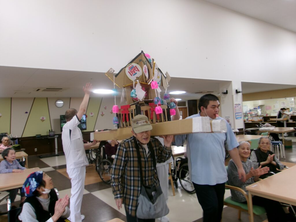 祭りの雰囲気を楽しんでいただこうと、職員手作りの御神輿をホール内で練り歩き、掛け声で盛り上げました。