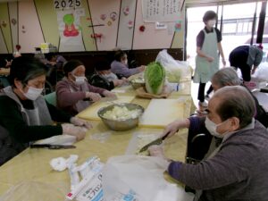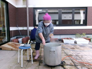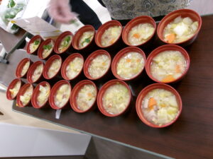 利用者様には、昔取った杵柄で手際よく野菜を切っていただき、和気あいあいと準備が進みました。中庭では職員が大鍋で野菜を煮込み、立ちのぼる湯気に秋の香りが広がります。片付けを終えた利用者様たちが、まるで“お姑さん”のようにじっと鍋の様子を見つめる姿もあり、思わず笑みがこぼれる一幕となりました。